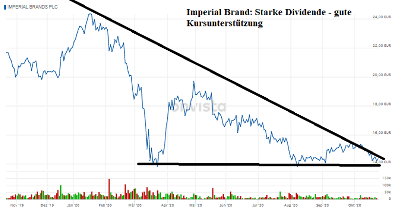 Interessant ist meiner Meinung nach der Konzern Imperial Brands. Aktuell schätzen Analysten für diese Aktie eine mögliche Dividendenrendite in Höhe von gut 10 %. Wenn Sie also heute investieren würden, dann würden Sie auf den Kurs – wenn alles wie geplant läuft – im kommenden Jahr 10 % allein an Dividende erhalten.